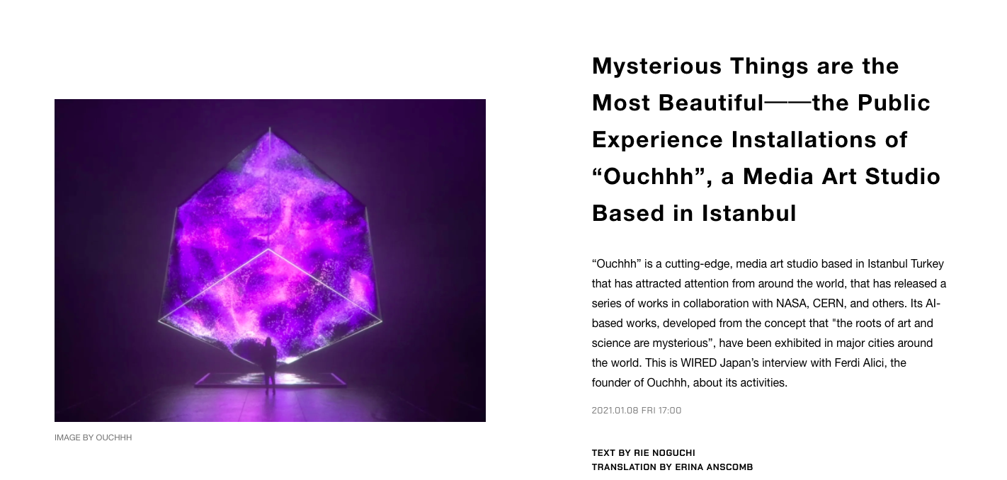 _Interview is online!“Ouchhh” is a cutting-edge, media art studio based in Istanbul Turkey that has attracted attention from around the world, that has released a series of works in collaboration with NASA, CERN, and others. Its AI-based works, developed from the concept that "the roots of art and science are mysterious”, have been exhibited in major cities around the world‘’https://wired.jp/2021/01/08/new-media-studio-ouchhh-en/